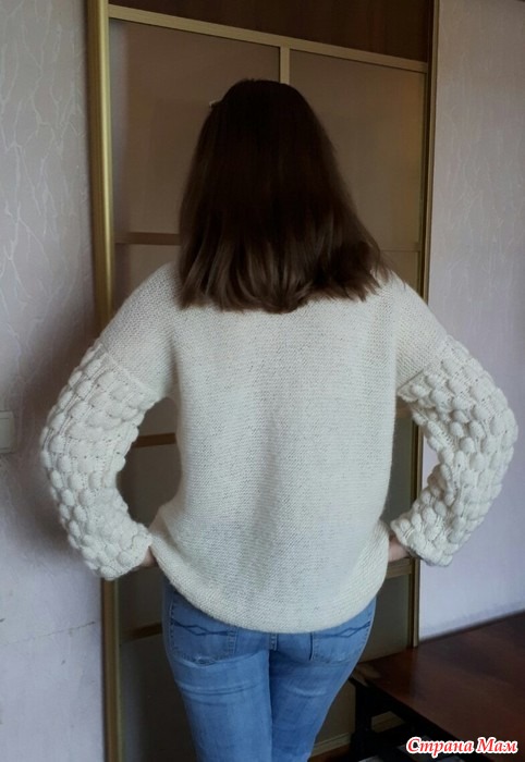 При вязании использовала спицы: N2,5 - резинка 1х1; N3,5 - платочное полотно; N4 - узор "Малинки" на рукавах. Размер пуловера 48-50.