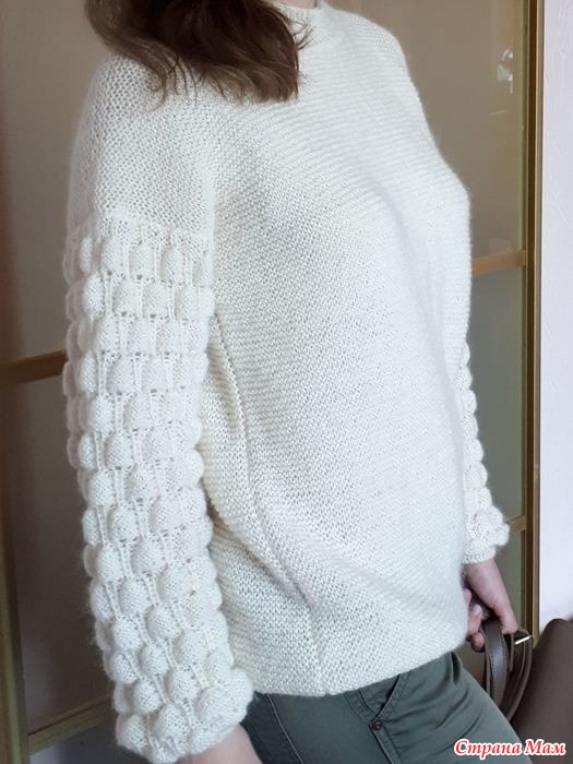 При вязании использовала спицы: N2,5 - резинка 1х1; N3,5 - платочное полотно; N4 - узор "Малинки" на рукавах. Размер пуловера 48-50.