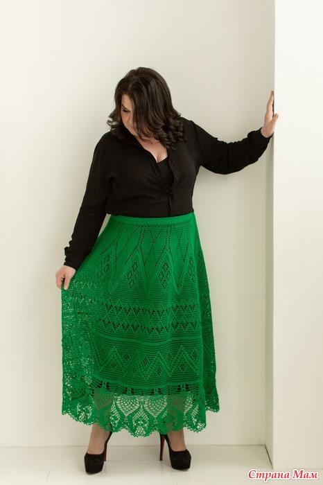 Юбка зелёная, пряжа Анна 16, расход 800г, размер 58-60. Кр. 1.5 кловер