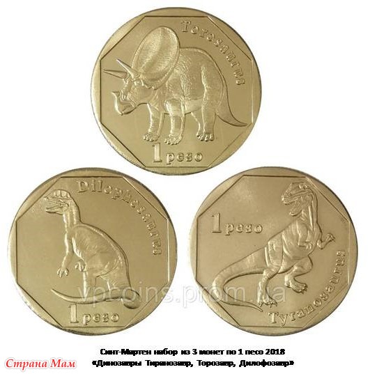 Карибы. Сент-Мартен набор из 3 монет по 1 песо 2018 «Динозавры Тиранозавр, Торозавр, Дилофозавр»