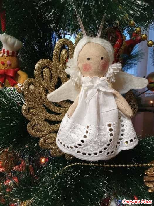 Просто Ангел (сшит из тонированной чаем бязи+кусочек батистового шитья и чуть-чуть белой пряжи для вязания неизвестной уже марки). Украшает новогоднюю ёлку .