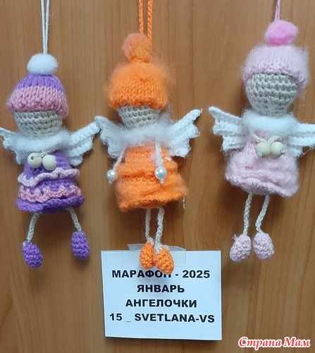 Ангелочки связаны из пряжи Пехорка Детская новинка, крючок 1 мм и спицы 1,5 мм, наполнитель синтепон. Применила готовые помпоны для детского творчества. На ручках деревянные и стеклянные бусины.