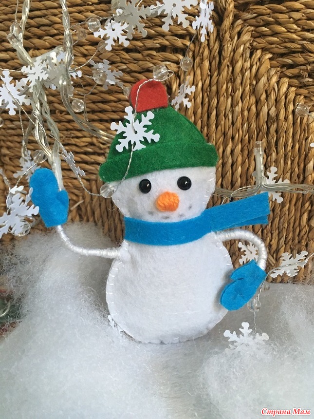 Снеговик. Фетр разных цветов, нитки х/б, наполнитель, проволока для ручек.
