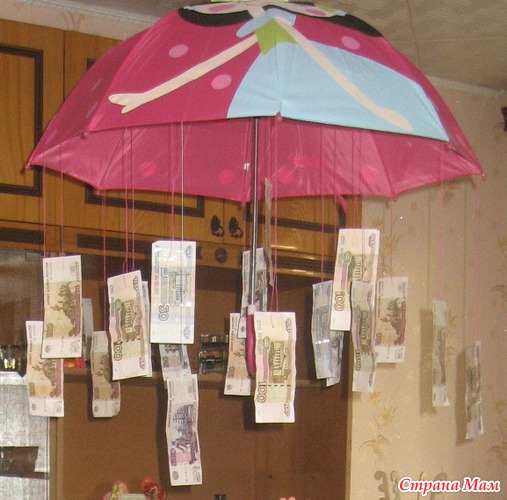 ну, да, в закрытом виде, но открыла над молодыми сама со всякими "присказками" про то, как этот зонтик будет сближать их в плохую погоду (в сложных жизненных ситуациях) - он ведь один на двоих, нужно как следует прижаться друг к другу! и про то, как он будет им помогать (материально )
