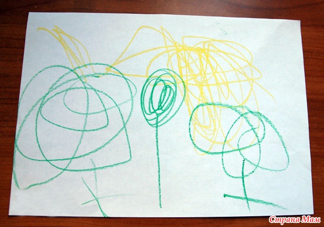 Рисовала детка (1 г. 7 мес.). Мама только показала, как рисовать дерево (в центре). Все остальное деть рисовала сама.