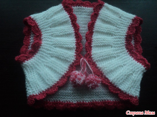 Далее петли распределить следующим образом : 3.5см (у меня 8 петель) провязывать платочной вязкой, середина лицевыми, оставшиеся 3.5см –платочной вязкой. И так у нас будет до конца спинки.