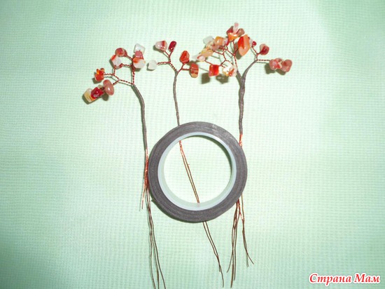После того как сплетем нужное колличество веточек, а это для маленького дерева 45-50 веточек как я делала дерево из АМЕТИСТА ,собираем веточки. Две маленькие веточки скручаваем вместе, обматывем коричневой флор. лентой, одну веточку обматываем флор. лентой, и присоединяем к двум веточкам, получилась большая веточка из 3 маленьких. Я делала таких 9 больших веточек по 3 маленькие веточки.