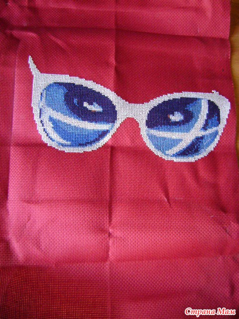 Пока вот только очки осилила. Обманули с размером канвы - с красю только 3 !!! крестика!!!! остаётся -расстроилась, отложила пока. А схема авторская! Людочка ждёт отшив от меня!