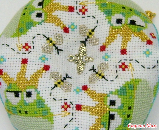 канва Аида 18, мулине Гамма, ДМС и Чехия, металик золотой и серебряный, золотые ажурные бусины, золотой бисер, шармик "пчелка", зеленая бусина