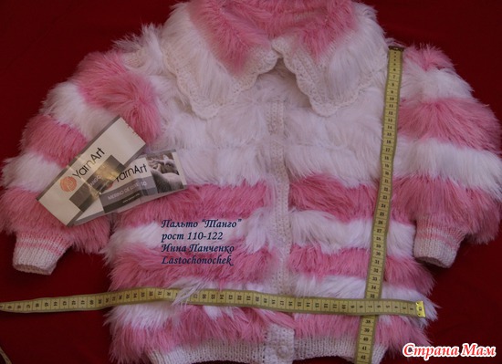 Вот такая шубка для юной модницы у меня получилась. Я решила назвать ее в честь использованной пряжи Tango, Честно признаюсь, хлопотное дело вязать полотно из этой "травки", ворс шелковистый, длинный, но результат того стоит. Такая магенькая, пушистенькая.