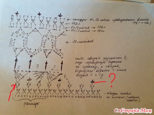 Там, где у Вас знак вопроса - это три пико и одну петлю основания. Так, где стрелочка - столбик с 2-мя накидами. Три пико делаются не в каждой секции, а через 2, а третьей.
