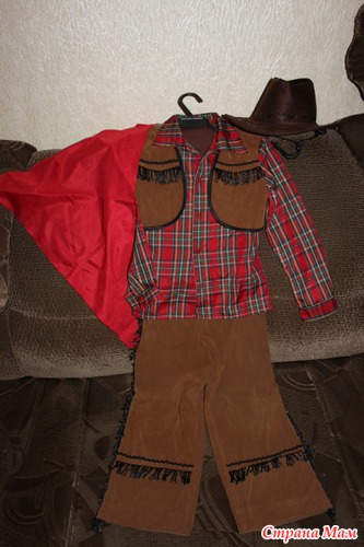 В комплект входит: брюки, жилет (пришит к рубашке), бандана, шляпа из замши. Размер 30. Одевали один раз в прошлом году, в хорошем состоянии