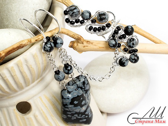 Кафф и асимметричные серьги со снежным обсидианом "Предзимье"