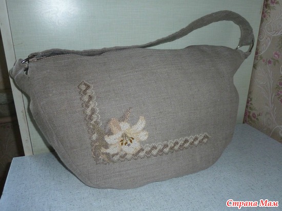 Ткань - лён (холст) , бязь суровая . 2 отделения, 2 кармана , молния , ручка на метал.кольцах. Вышивка - мулине, рисунок - цветок с готовой схемы , узор авторский.