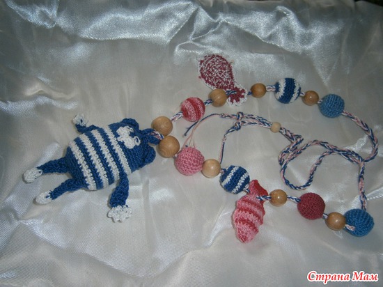 В бусах использовались:деревянные,можжевеловые бусины,киндер.--погремушка.Хлопок100%Рыбки мягкие,наполнитель синтепон.