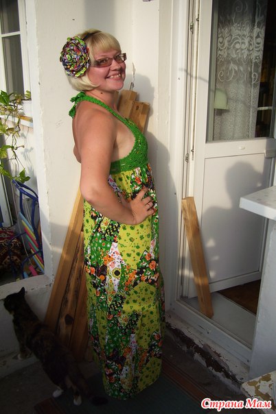 Вот это тот сарафан, который меня покорил!!! Красота необычайная!! Расцветка ткани фантастическая, вязаный лиф изумительный, цвет пряжи в "10", а цветок в причёске просто шедевр!! Вы в этом костюме - царица на отдыхе. Красота!!!