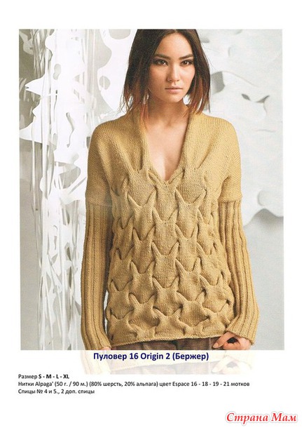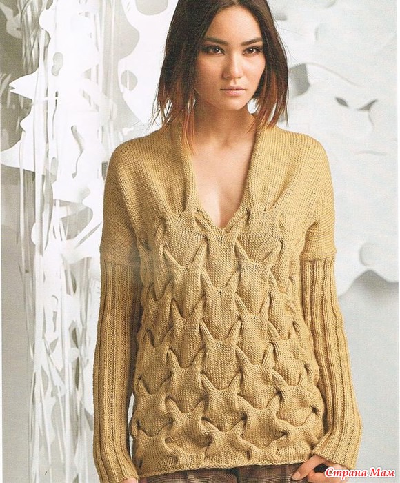 Очень нравится мне эта модель. Такой стильный пуловер встретишь не каждый день; узор в виде кос, но результат впечатляет.