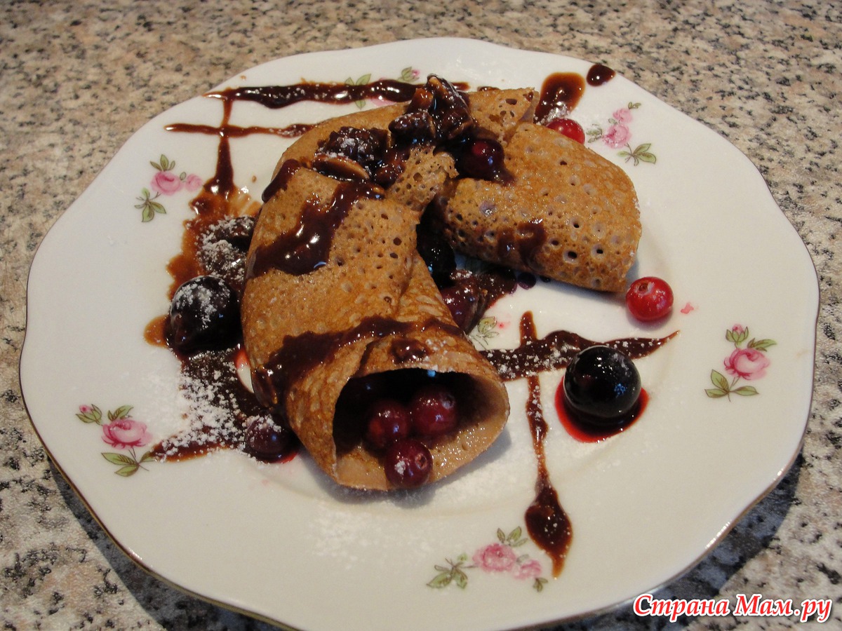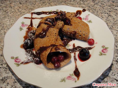 а на десерт-блинчики шоколадные по-французски, из необычного по составу теста, фаршированные ягодами .