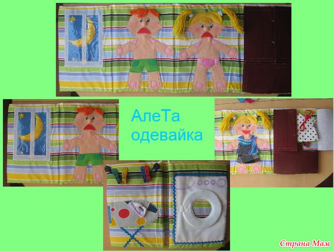 Мягкая книжка Одевайка второй вариант. Куколки мальчик и девочка с одежками по временам года. Добавлена стиральная машинка и гладильная доска с веревкой для сушки белья. В окошко вставляем карточки по временам года и суток. Читать полностью