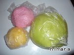 Добавляем краситель (предварительно растворить в 1мл воды, могу сказать, что цвет в чайной ложке должен быть очень-очень насыщенный!). Начинаем добавлять сахарную пудру, причем ее нужно обязательно просеивать!!! Сколько ее нужно не могу точно сказать. Сначала мешаете ложкой, когда ложкой будет очень тяжело, то руками. Консистенция должна стать как пластилин и мастика не должна липнуть к рукам, но тут главное не перестараться с сахарной пудрой. У меня одна порция получилась довольно-таки "крутая" мастика и не смогла из-за этого тонко раскатать.