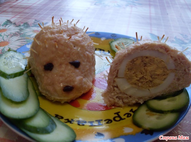 сделать лепешку из фарша,положить фаршировнное яйцо и закрыть лепешку. Сформировать форму ёжика,сделать глазки и носик(брала чернослив),а иголки сделать из вермишели(сырой).