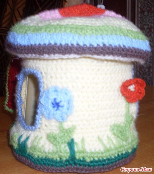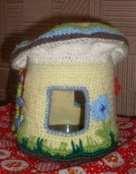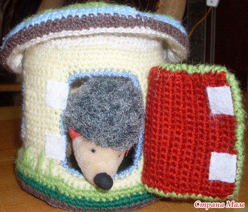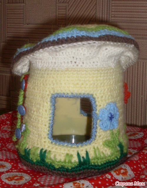 Вот такой грибок-теремок я нашла на просторах интернета на сайте www/darnika.Мне он очень понравился.И даже я,не умея вязать крючком,решилась на эту затею.Тем более что у darniki хорошее описние.За кркас домика берется пустое пластиковое ведро(из под майонеза).Вырезаем окна,дверь и стеночки обвязываем ст.б\накида по кругу.По низу вывязывается травка,цветочки я пришывала отдельно.По кругу вывязывается и шляпка-крыша.Дверь на липучках-открывается и даже можно снимать с петелек-пуговиц.А вот ставенки не получились уменя.Каждый раз они у меня выходили все разные(вязыла-то крючком впервые),поэтому обошлись и без них.Теперь в нашем домике живет ежик.