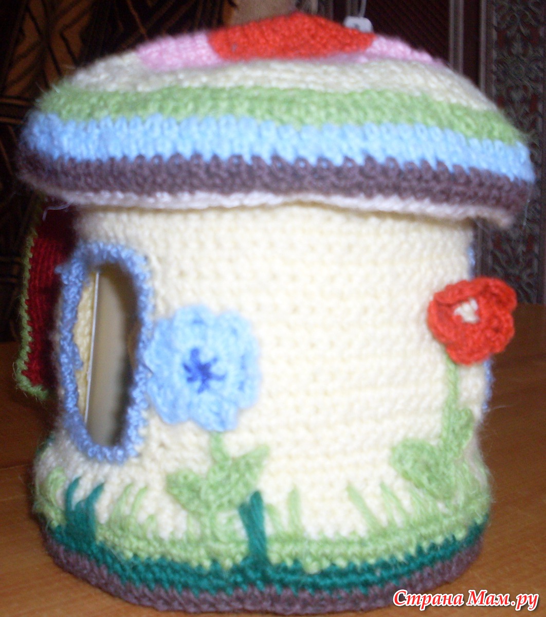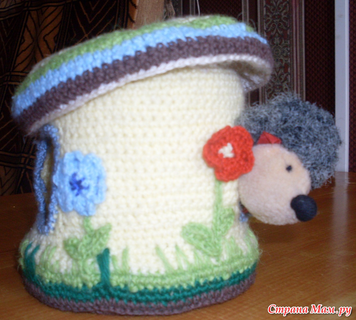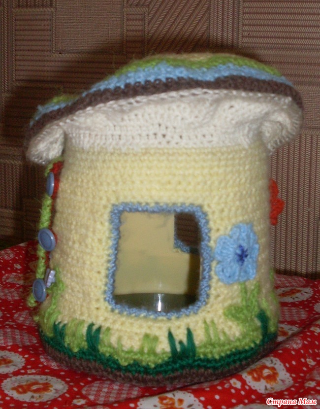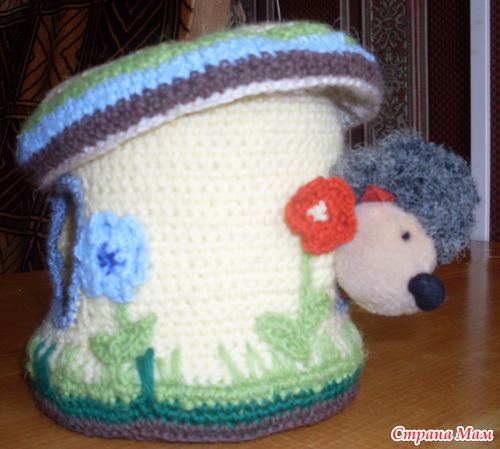 Вот такой грибок-теремок я нашла на просторах интернета на сайте www/darnika.Мне он очень понравился.И даже я,не умея вязать крючком,решилась на эту затею.Тем более что у darniki хорошее описние.За кркас домика берется пустое пластиковое ведро(из под майонеза).Вырезаем окна,дверь и стеночки обвязываем ст.б\накида по кругу.По низу вывязывается травка,цветочки я пришывала отдельно.По кругу вывязывается и шляпка-крыша.Дверь на липучках-открывается и даже можно снимать с петелек-пуговиц.А вот ставенки не получились уменя.Каждый раз они у меня выходили все разные(вязыла-то крючком впервые),поэтому обошлись и без них.Теперь в нашем домике живет ежик.