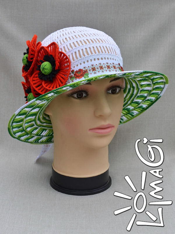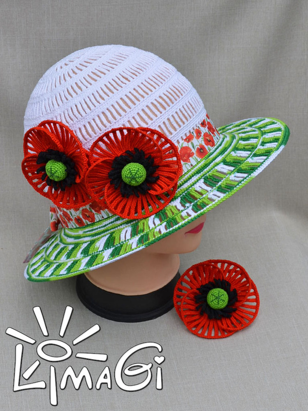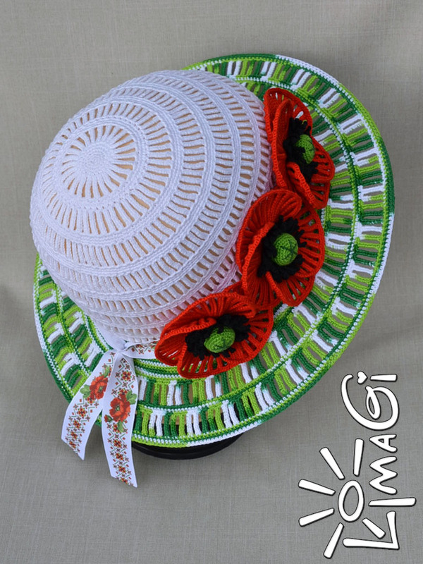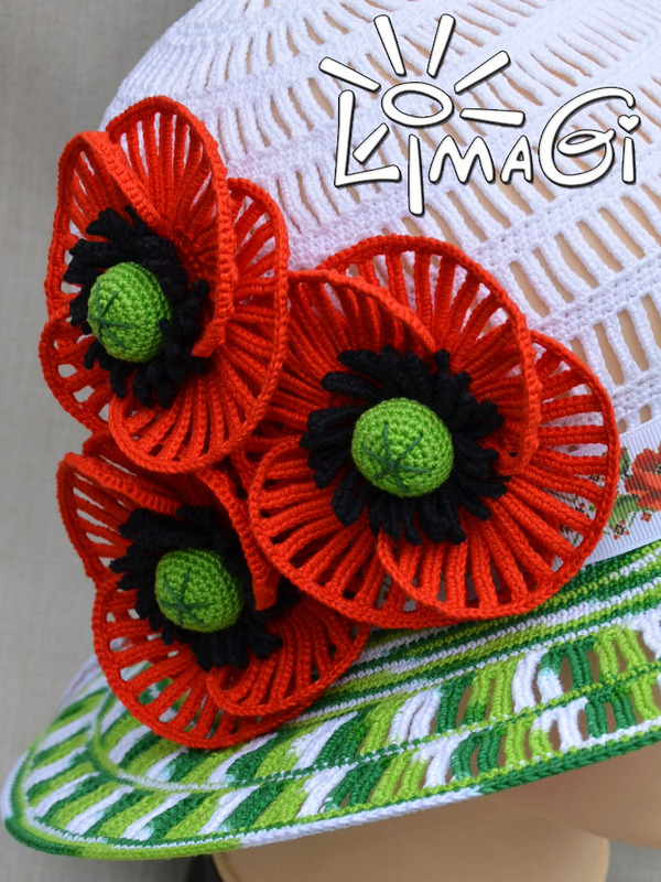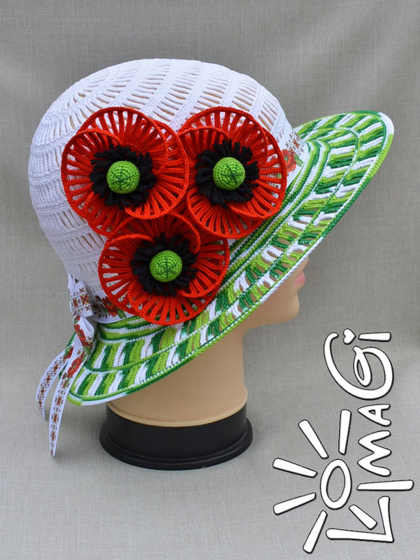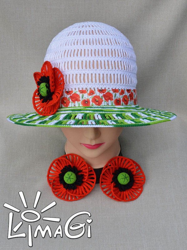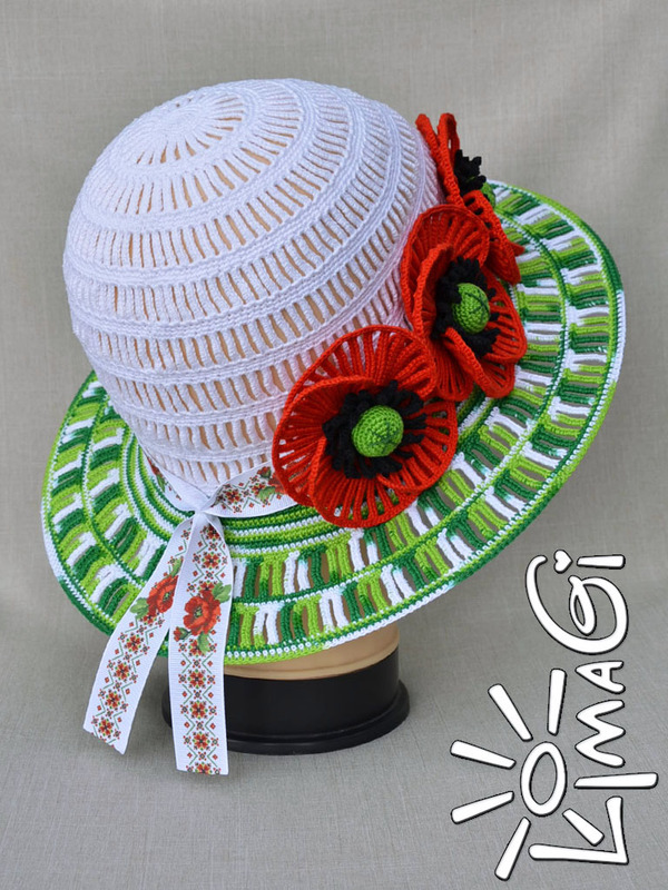 Узор продумывала простой, но с изюминкой. Даже если не учитывать то, что не хотелось отвлекать внимание от таких маков, на полях данный узор помог подчеркнуть достоинства меланжевой пряжи, ведь ее вообще очень сложно удачно применить. В маке и лепестки, и тычинки связаны под стать узору. Люблю целостность в изделии, когда все взаимосвязано и перекликается. А цвет сердцевины маков есть в меланже полей. Цветы съемные, что позволяет их размещать не только на шляпе, но также как брошь на груди или на резинках для кос. Дополнила образ подходящими по смыслу и расцветке лентами. Тонкую можно размещать по нижнему ярусу узора, используя палочки как шлевки. В начале планировались и листья к макам в том же стиле. Но на полях и так много зелени, листья лишь добавляли рябь в глаза, ни один из опробованных вариантов я не утвердила.