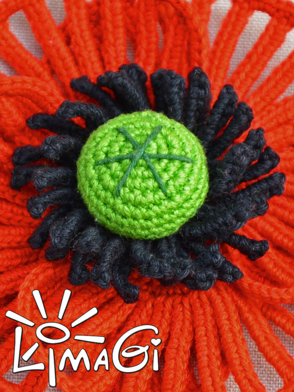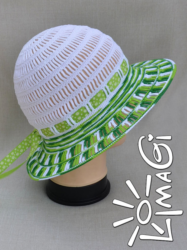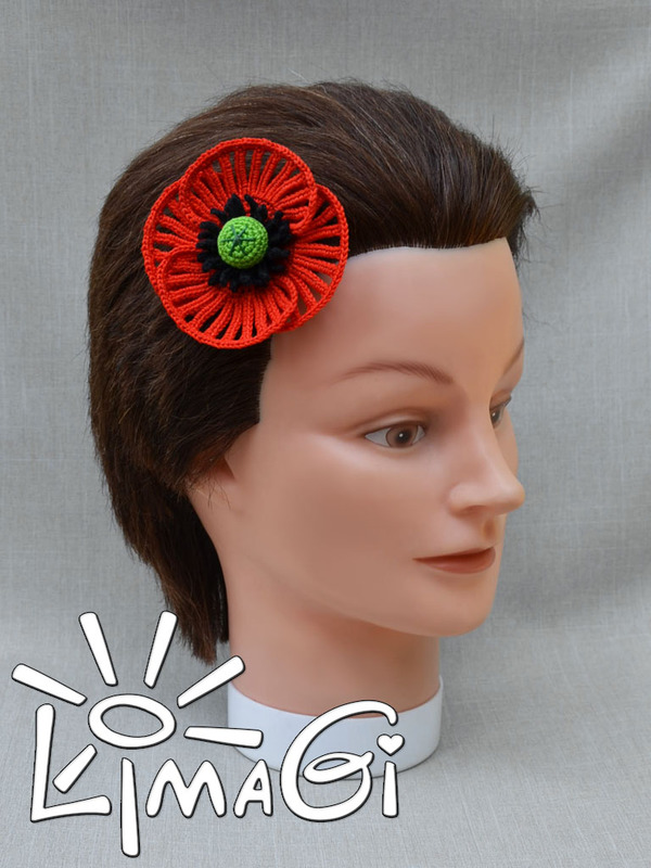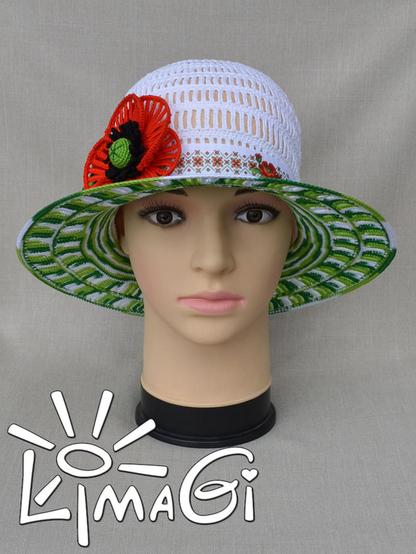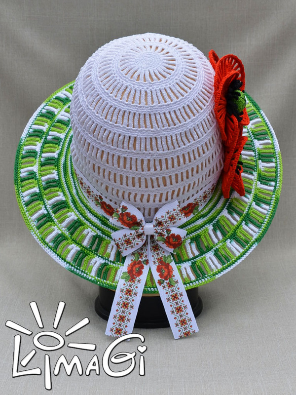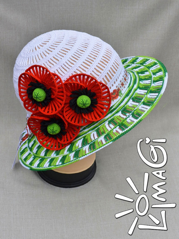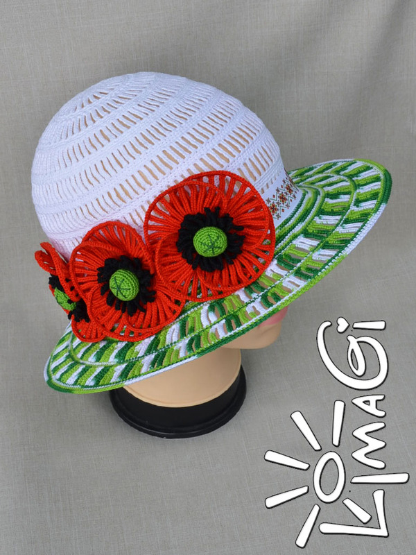 Узор продумывала простой, но с изюминкой. Даже если не учитывать то, что не хотелось отвлекать внимание от таких маков, на полях данный узор помог подчеркнуть достоинства меланжевой пряжи, ведь ее вообще очень сложно удачно применить. В маке и лепестки, и тычинки связаны под стать узору. Люблю целостность в изделии, когда все взаимосвязано и перекликается. А цвет сердцевины маков есть в меланже полей. Цветы съемные, что позволяет их размещать не только на шляпе, но также как брошь на груди или на резинках для кос. Дополнила образ подходящими по смыслу и расцветке лентами. Тонкую можно размещать по нижнему ярусу узора, используя палочки как шлевки. В начале планировались и листья к макам в том же стиле. Но на полях и так много зелени, листья лишь добавляли рябь в глаза, ни один из опробованных вариантов я не утвердила.