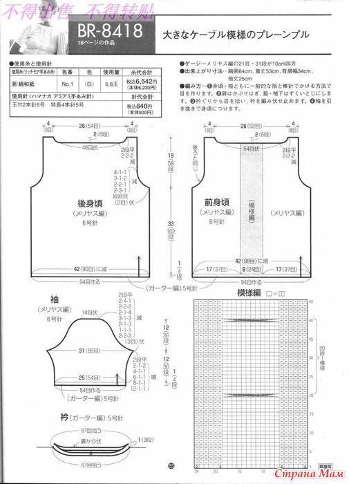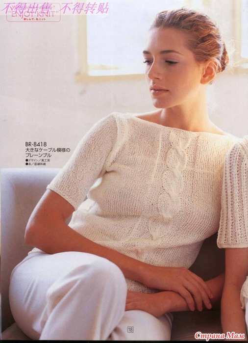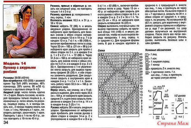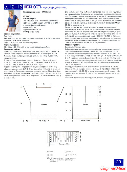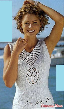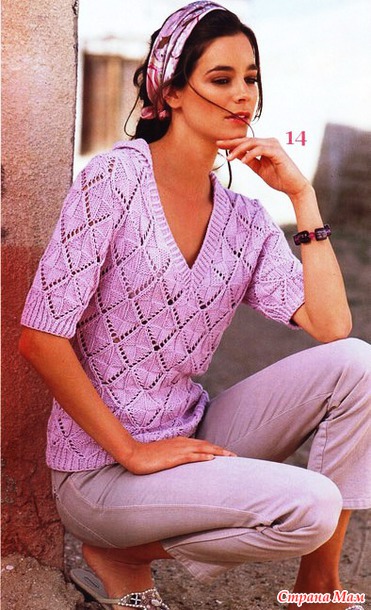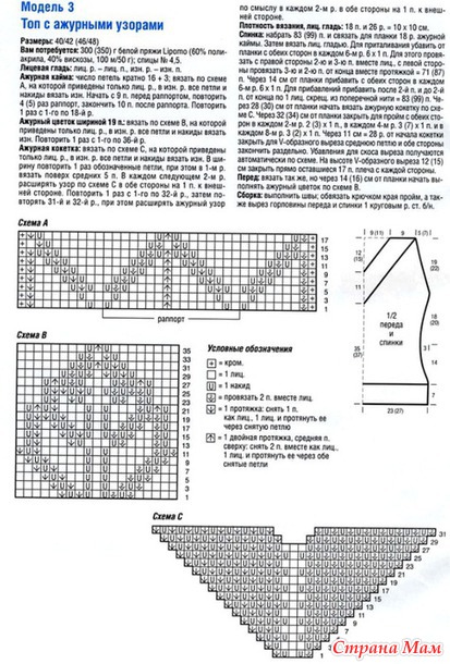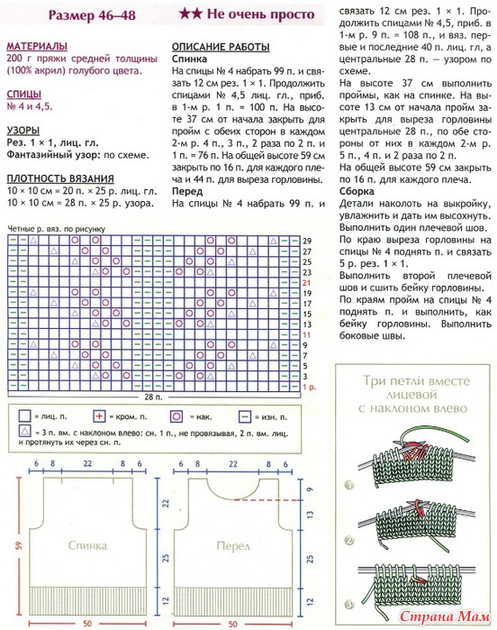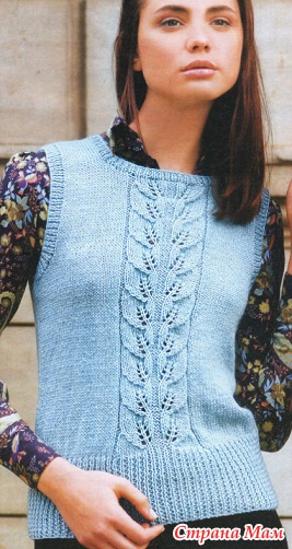Перед: вязать как спинку, но с самого начала выполнять на средних 35 п. ажурный мотив, а п. по обе стороны от него - лиц. гладью. Расширить ажурный узор, как указано. После последнего р. схемы продолжить вязать на всех п. лиц. гладью.