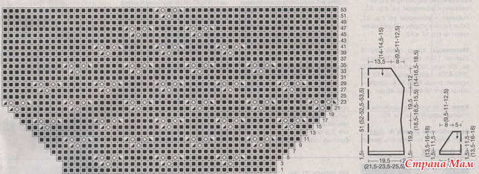 Ажурный мотив: вязать по схеме. Распределить п. согласно инструкции. Вязать 1х р. 1-52.