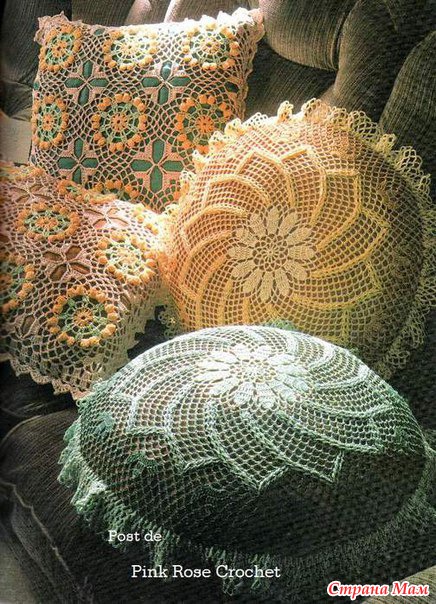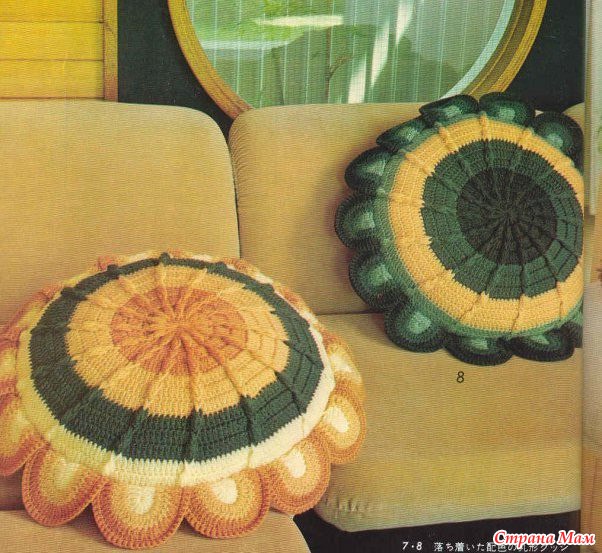Замечательная подборка,спасибо очень понравились полосатые-разноцветные подушки-"солнышки" на диване(7 и 8)-цветное фото, а схему не увидела покажите,пожалуйста, ее еще раз