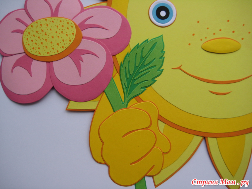 Здравствуйте дорогие мастерицы! Делюсь с вами ещё одной идеей для оформления детской комнаты. Рисунок солнышка увидела в интернете и сразу представила как я его сделаю. Заказ выполнен два года назад. Моя заказчица - внучка. Аппликация наложением слоёв цветного картона плотностью 270 гр. Общий размер солнышка 38 х 55 см.