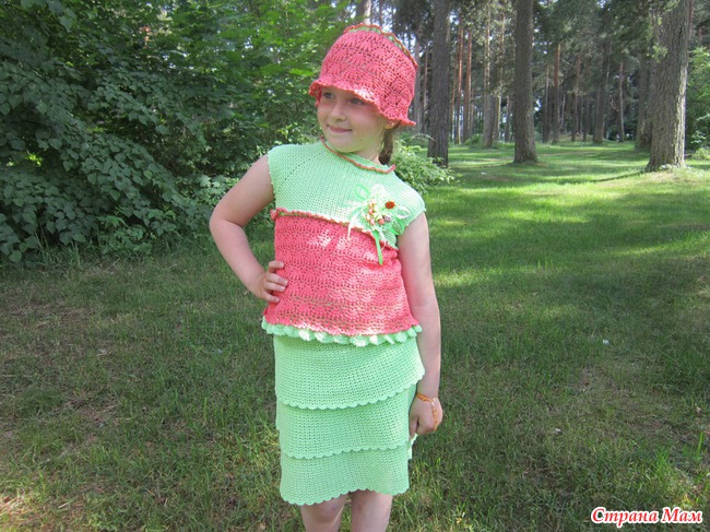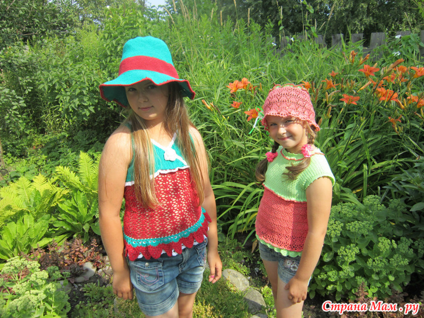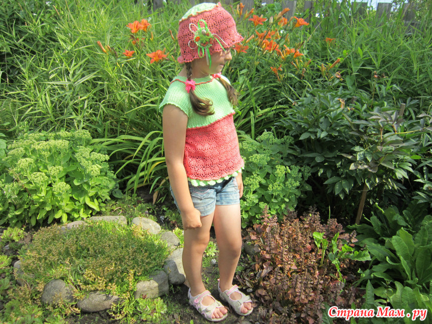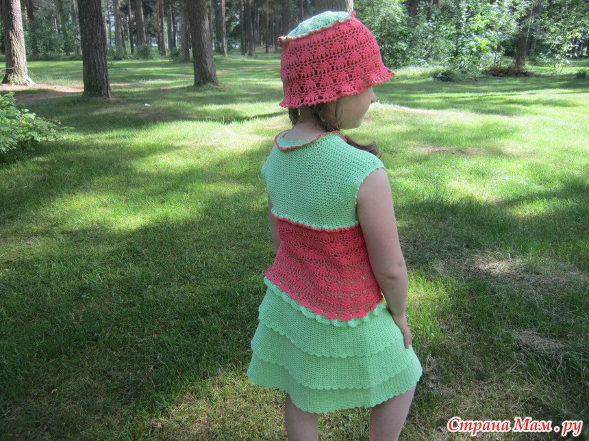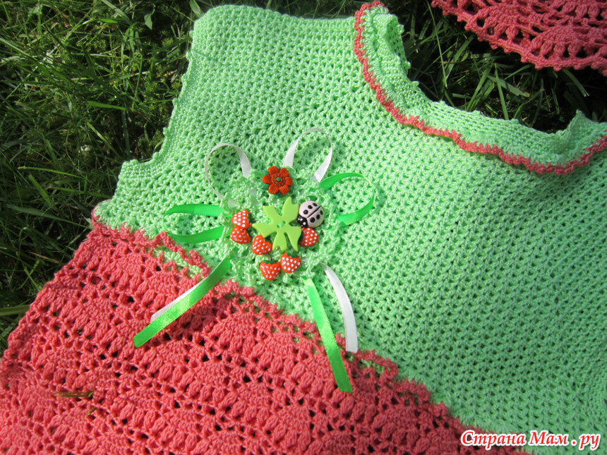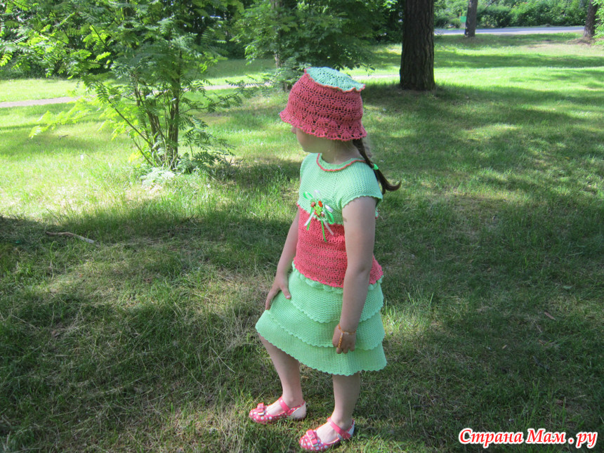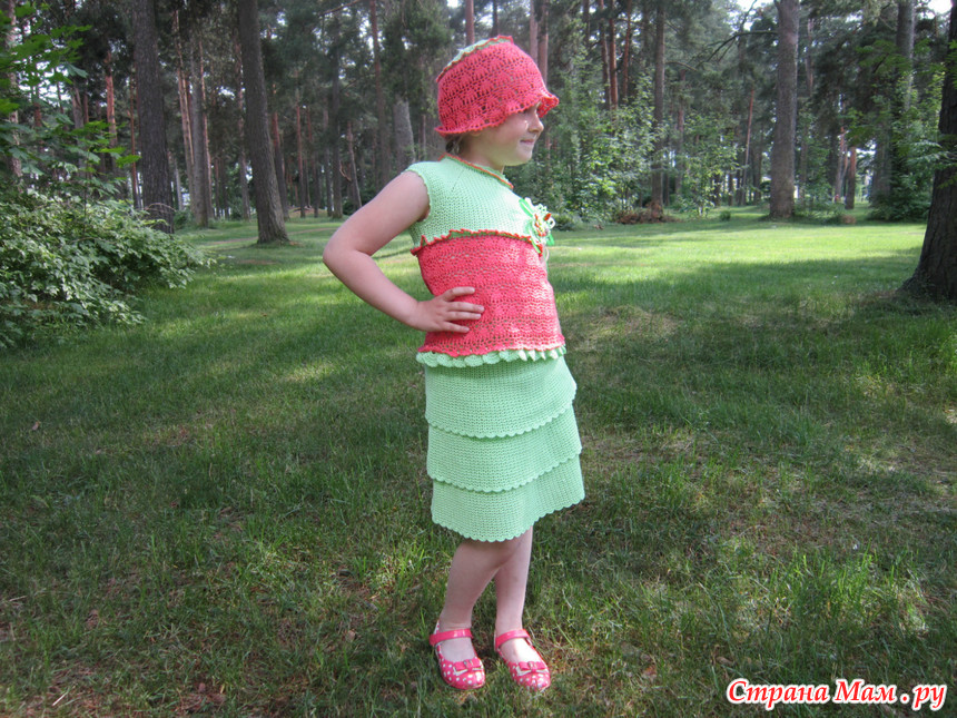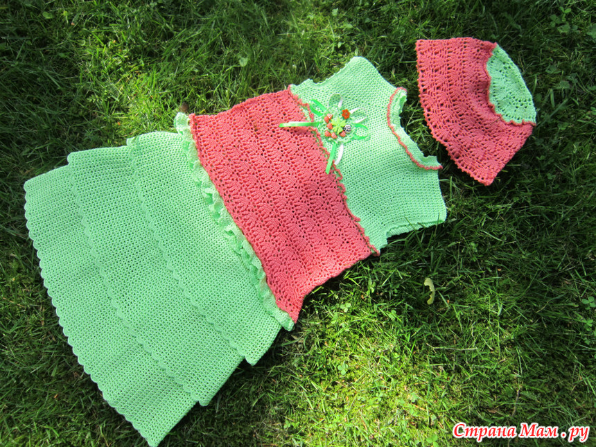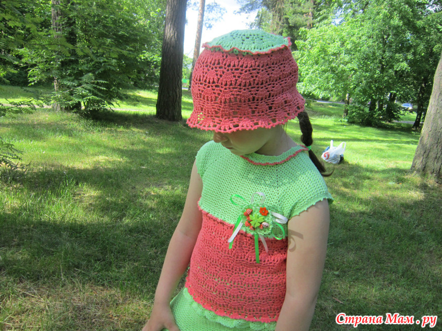 Первый опыт вязания был в прошлом году, я вязала комплект "Клубничка" для старшей дочери https://www.stranamam.ru/post/8582957/ В этом году связала для своей младшей дочки комплект "Земляничка".