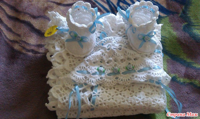 Целая история получилась! Заказали заранее на выписку плед с шапочкой и пинетками, долго выбирали, обсуждали, хорошо что вязать начала сразу, а не отложила. Мальчишка решил на свет появится почти на 2 месяца раньше, я в ускоренном темпе довязывала, вообщем успела!