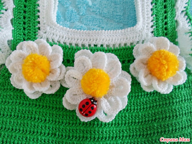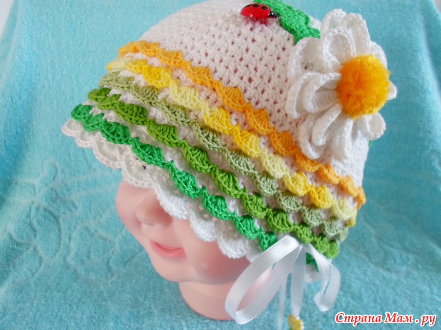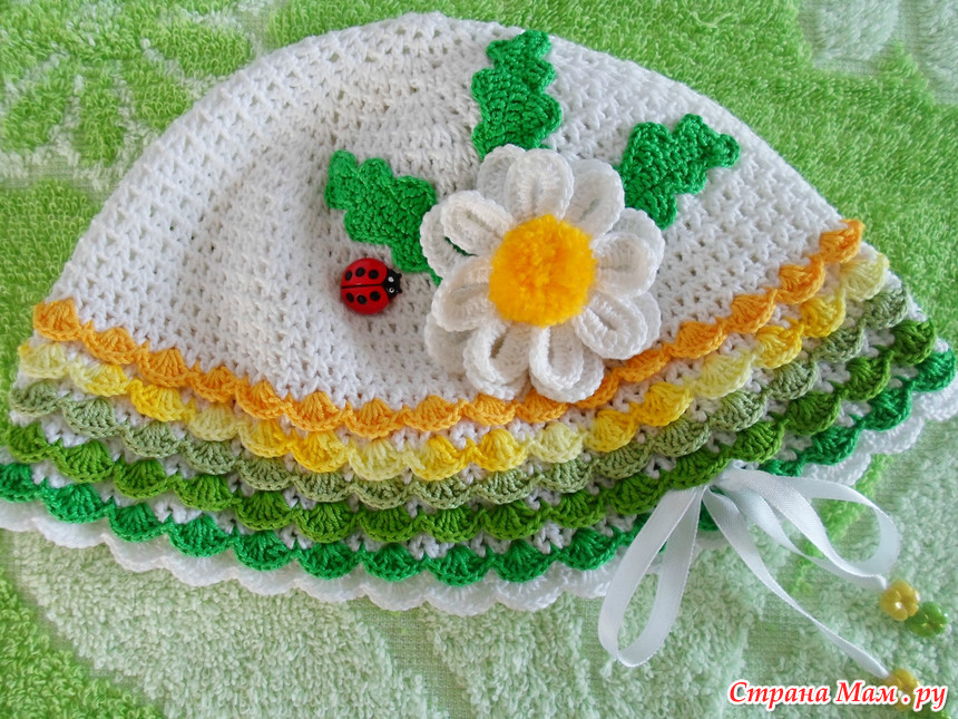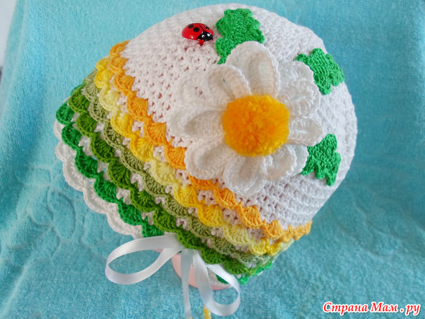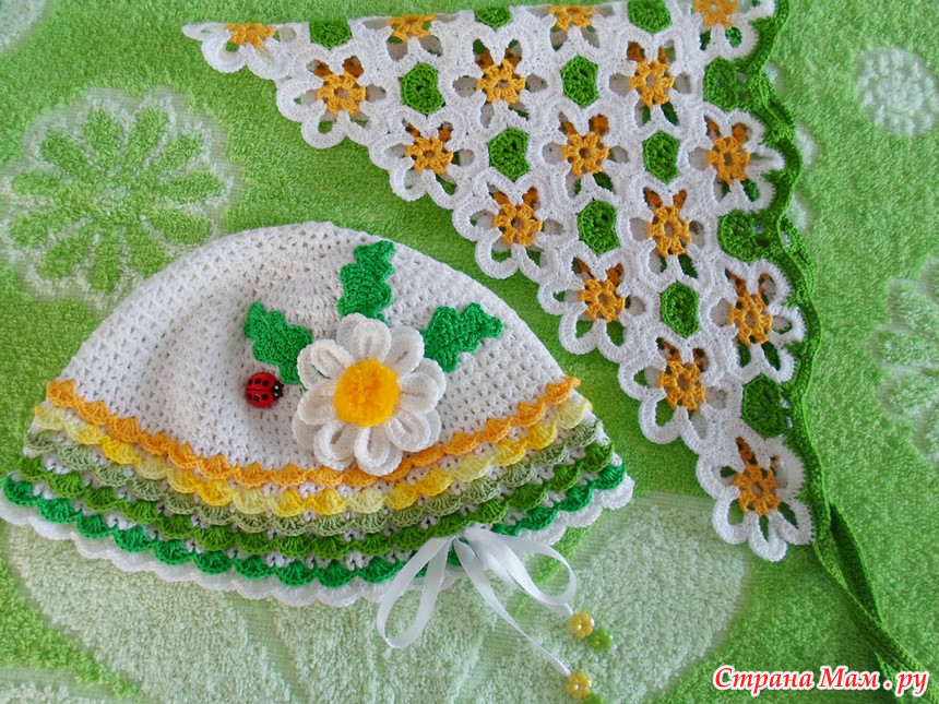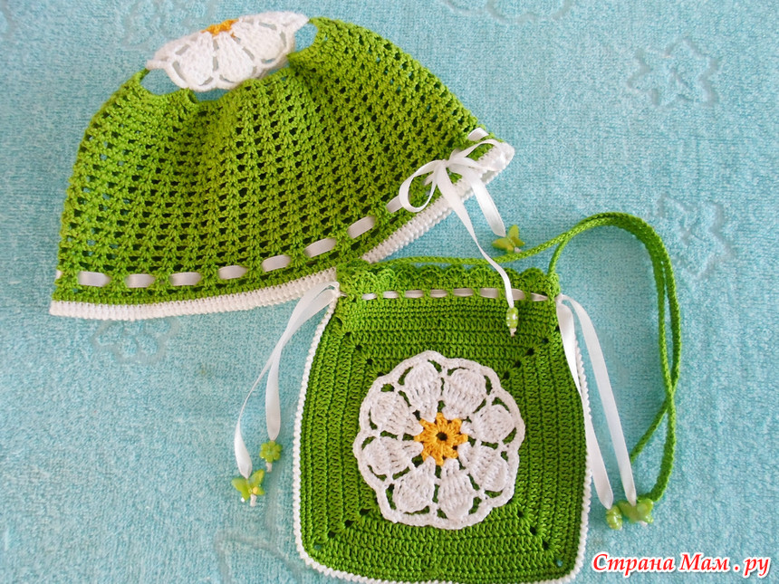 МК по шапочке здесь https://www.stranamam.ru/post/9944453/, сумочка-просто бабушкин квадрат с нашитой ромашкой по схеме донышка шапочки.