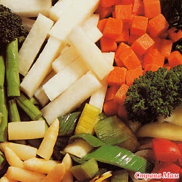 Замораживают овощи по отдельным культурам и в смеси для первых блюд: суп, щи, борщ, гарнир; ко вторым блюдам - смесь горошка и моркови и т. п., а также овощные рагу, овощные котлеты, смесь овощей с грибами. Для овощных смесей замораживают также картофель, свеклу, лук и помидоры.