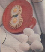 Готовится она очень быстро. Для этого надо иметь готовое картофельное пюре и яйца. Возьмите сковородку или керамическое блюдо, смажьте маслом, выложите «восьмеркой» картофельное пюре из кондитерского мешочка (целлофанового пакета с обрезанным уголком). Выпустите в образовавшиеся круги два яйца и поставьте на несколько минут в духовку. Яичницу можно подать с зеленым горошком и зеленью.Приятного аппетита!!!