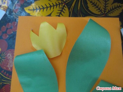 из красной и желтой бумаги вырезаем тюльпан, его просто вырезать если сложить квадратик цветной бумаги и вырезеть по линиям как на фото