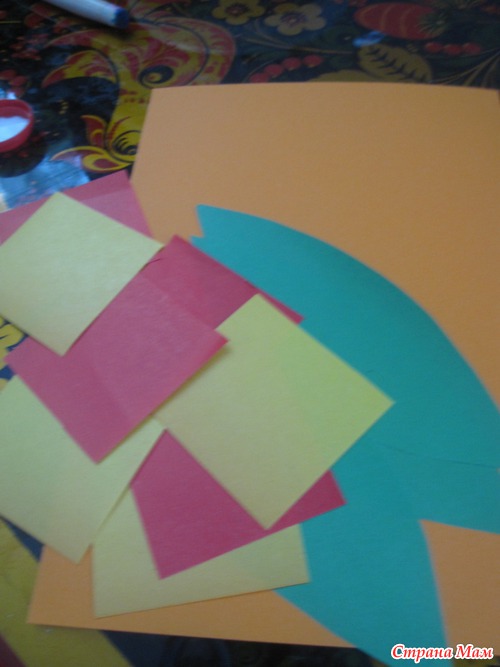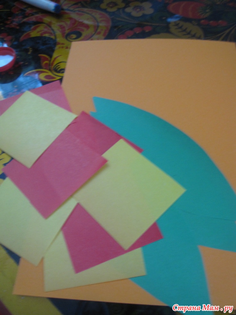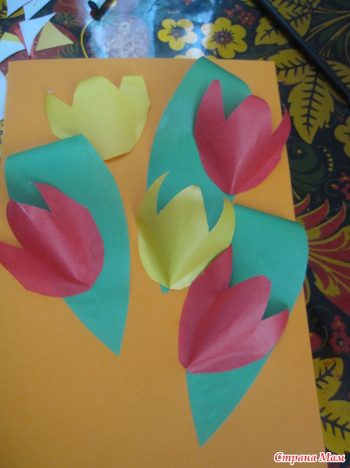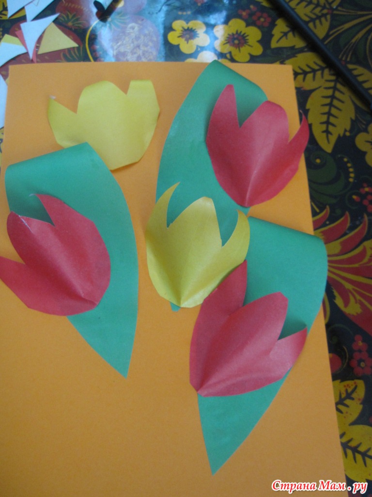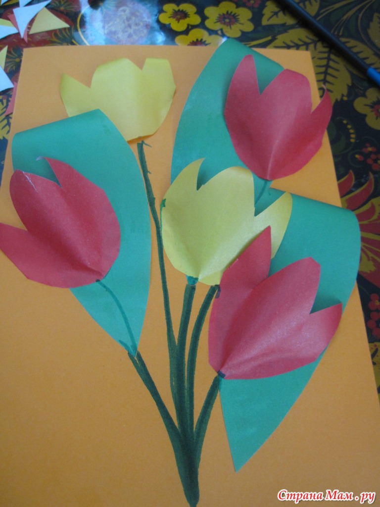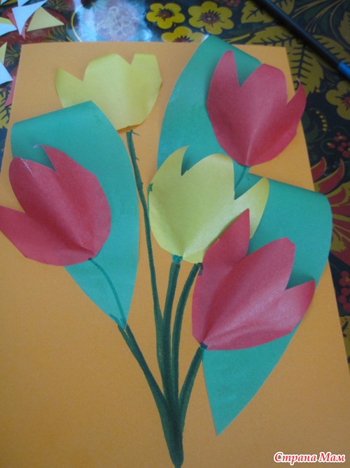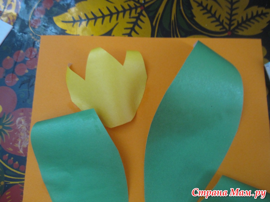 из красной и желтой бумаги вырезаем тюльпан, его просто вырезать если сложить квадратик цветной бумаги и вырезеть по линиям как на фото