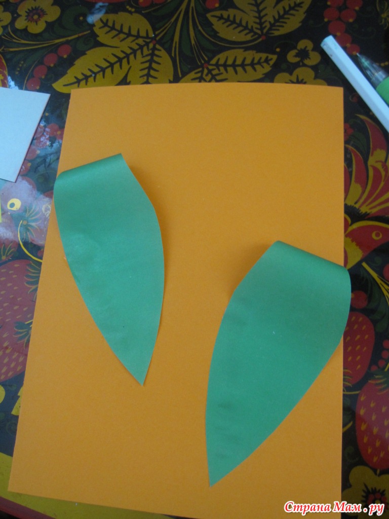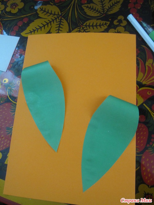 из зеленой бумаги вырезаем листья и немного подкручиваем их при помощи ножниц, нмазываем клеем одну сторону литка и приклеиваем на картон