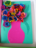 Из картона вырезаем вазу и приклеиваем на основу для открытки, а из гофрированной бумаги вырезаем кружочки