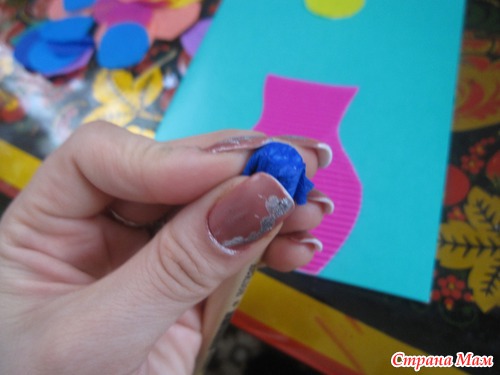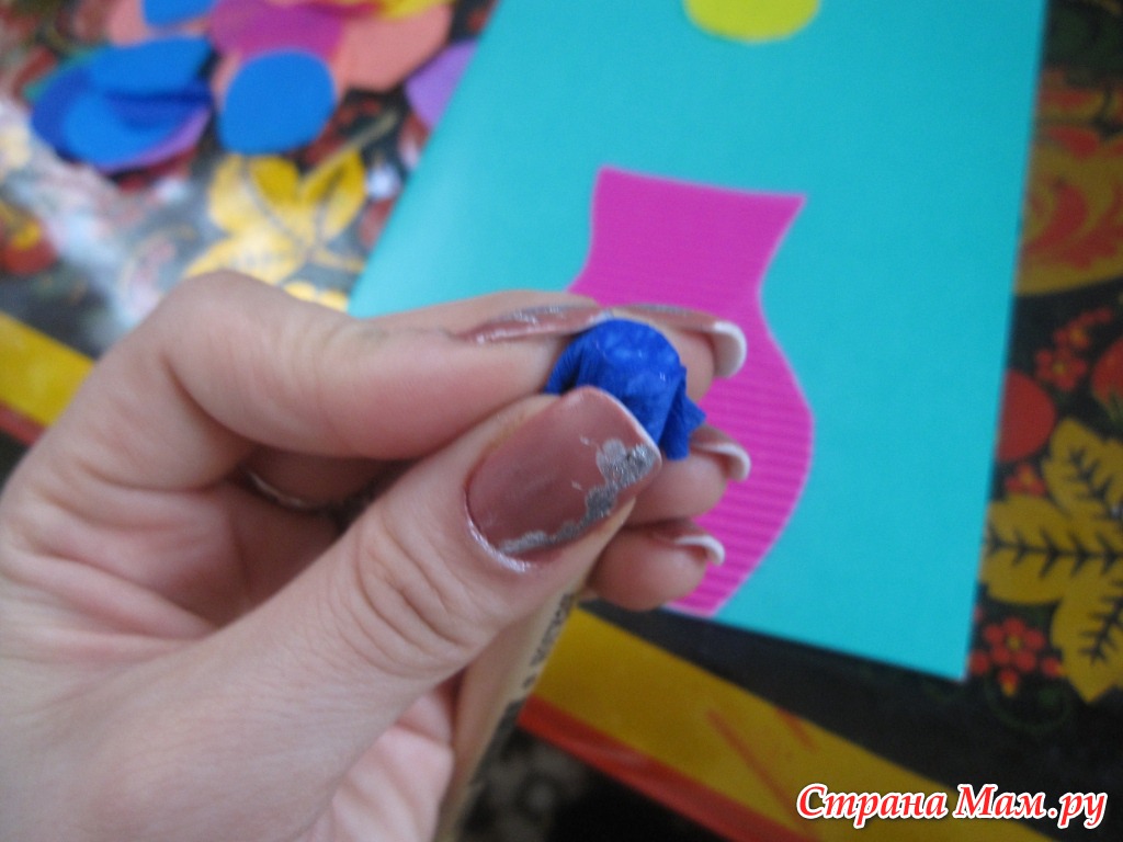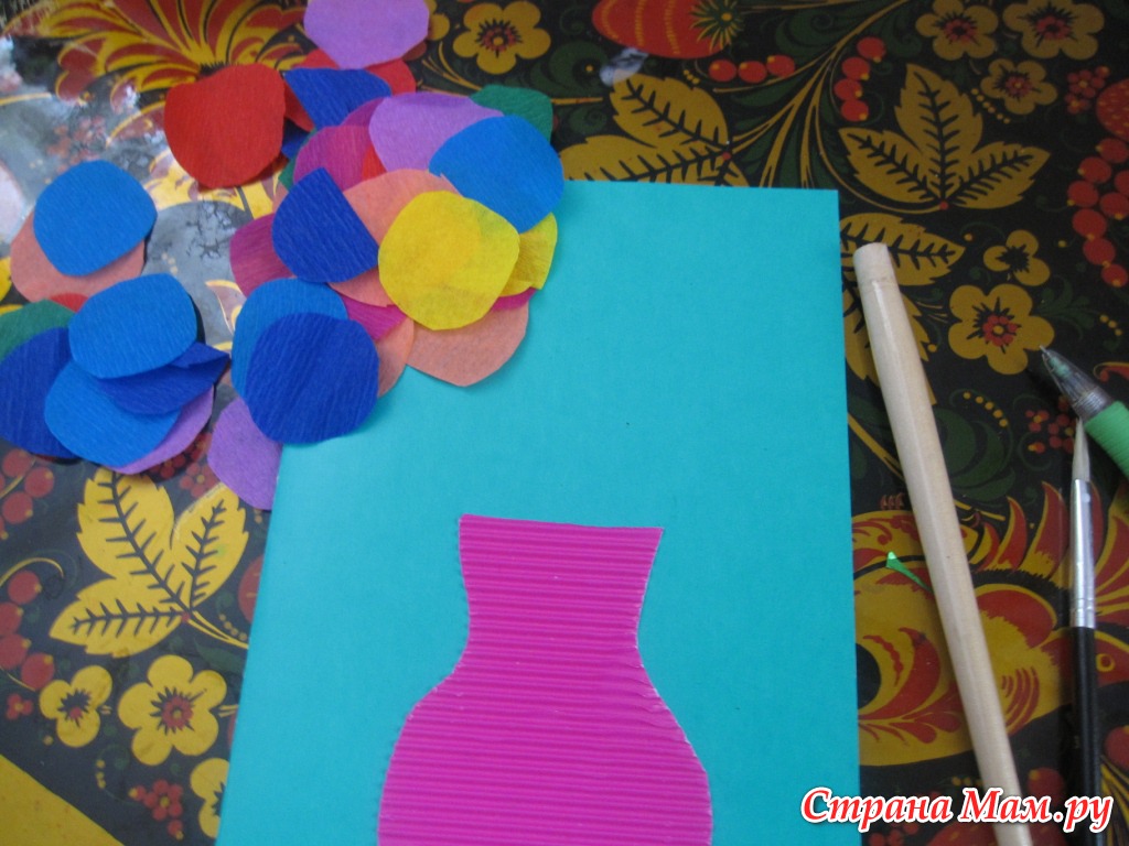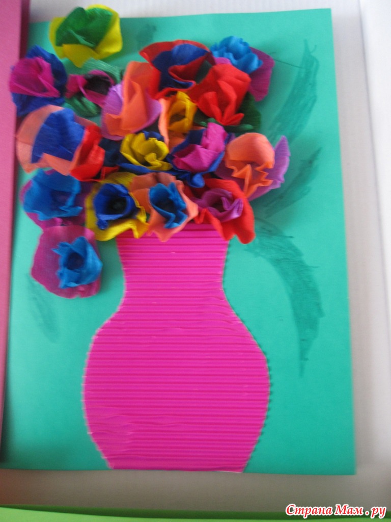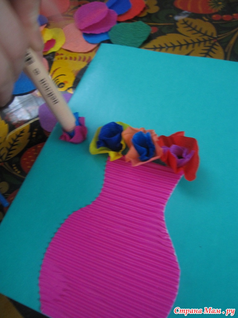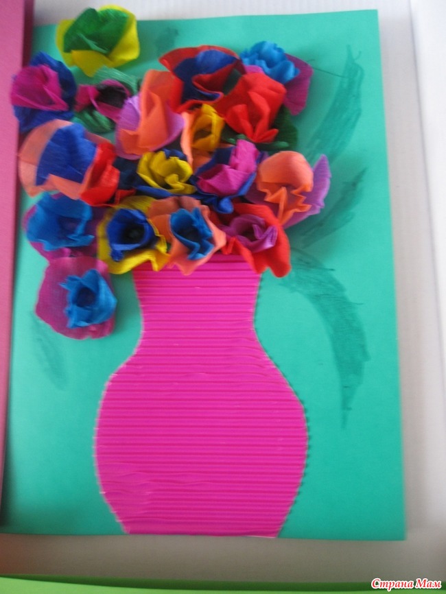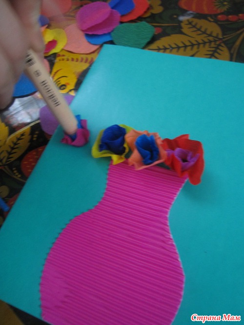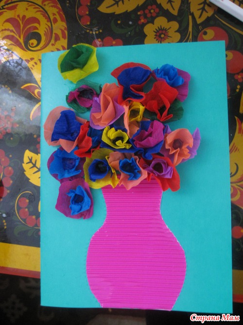 Из картона вырезаем вазу и приклеиваем на основу для открытки, а из гофрированной бумаги вырезаем кружочки
