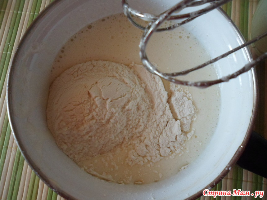 добавляем стакан муки и продолжаем взбивать