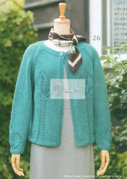 Нежно зелёный кардиган с рукавом реглан и узором из листьев на рукавах и полочках