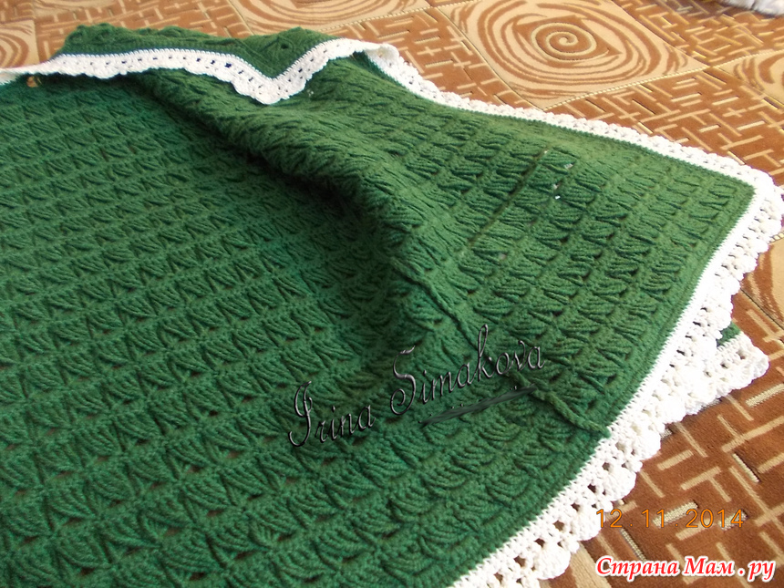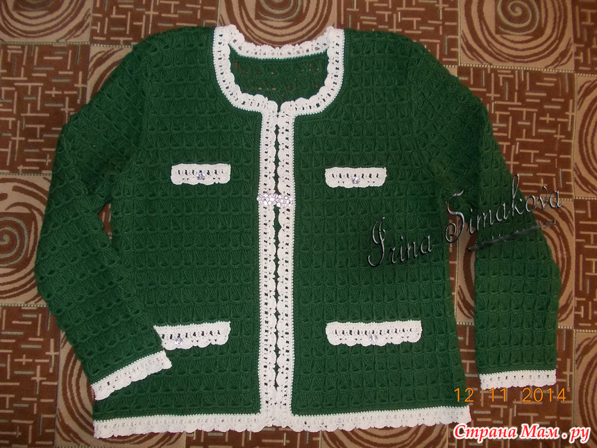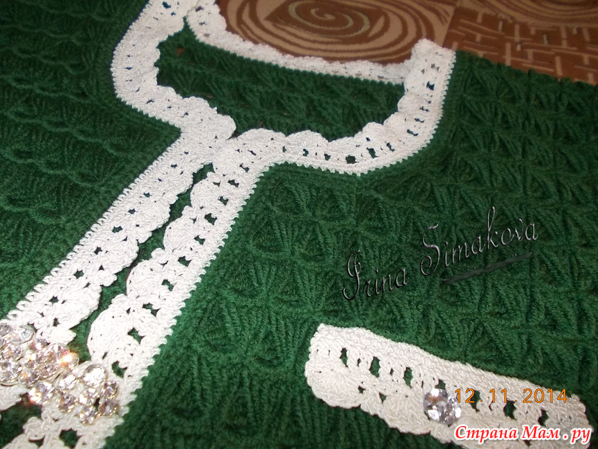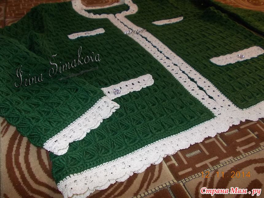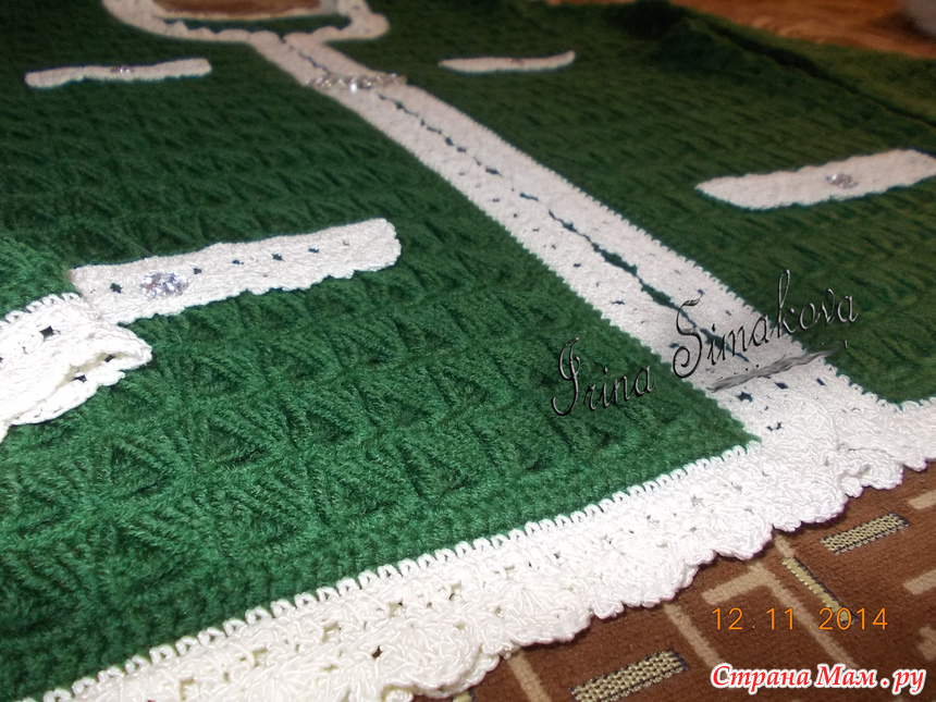 Ниточка Bambino NAKO (75% акрил, 25% шерсть, 130/50г) ушло около 450 гр, кр. №3. ширина линейки 3 см, обвязка Aura ALIZE (80% микрофибра акрил, 20% полиамид; 100 грамм/340 метров), кр №1,8 ушло около 90 гр, 4 пуговицы со стразами на "кармашки" и одна застежка.