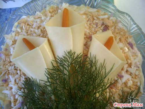 Украшение сверху сыр- каллы Тычинка - отварная морковь Зелень - укроп можно петрушку Очень вкусный салат