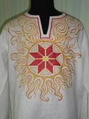 Оберегом здесь служила вышивка, содержавшая всевозможные священные изображения и магические символы. Языческий смысл народных вышивок очень хорошо прослеживается с древнейших образцов до вполне современных работ, недаром учёные считают вышивку важным источником в изучении древней религии.