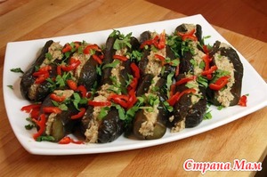 Опять кулинарю миксуя продукты и рецепты))). Ну не могу я делать все по строгому рецепту)). Вчера сделала обалденно вкусные баклажаны. Микс из рецепта Сациви и еще нескольких. Как всегда, делаем из того, что есть под рукой). Баклажаны, а они в этом случае обязательны и замене не подлежат, моем и насухо вытираем, хвостики я обрезала. Было их у меня пять штук среднего размера. Кладем в духовку на решетку и запекаем при температуре 200 градусов до того, пока они не станут мягкими и не "опадут" ). Вынимаем, остужаем. Разрезаем вдоль, не прорезая до конца, как бы делаем кармашки. На этом этапе, кому мешают баклажановые семечки, могут их убрать ложкой. В кармашки густо кладем начинку. Укладываем плотно в кастрюлю или чашку, поливаем сверху маслом, кладем веточки петрушки или кинзы, накрываем марлей, сверху тарелкой и под пресс. У меня так они простояли ночь, потом убрала в холодильник. Сегодня достала один, порезала кусочками и чуть язык не проглотила, как вкусно