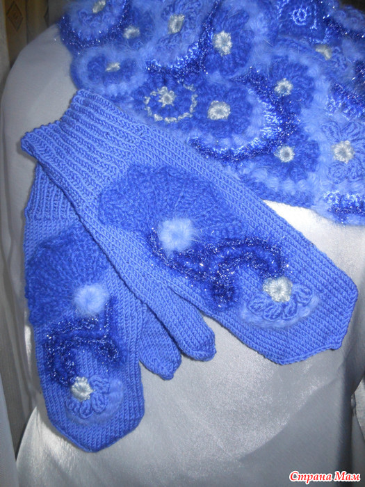 Комплект связан из разных ниток: "Angelo" - 42% супер кид мохер, 42% вискоза, 18% нейлон (20 гр); "Мерино платинум ново" - 100% мериносовая шерсть (100 гр.); "Ангора супер" - 70% ангора, 30% шерсть (25 гр.); "Меринос" - 100% шерсть (100 гр.); "Виктория" - 100% полиамид (50 гр.); "Muguet" - 100% полиамид (20 гр.).
